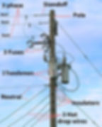 On the pole at the top are the high-voltage hot wires, generally connected by stand-offs and ceramic insulators. Then a wire connects to the fuse (switch), another set of ceramic insulators, and then the can-type transformer, which steps the voltage down to the final 110/220 volts going to your house on the drop wires, which connect to the weather head pole and down to your main panel.